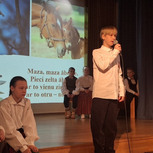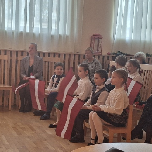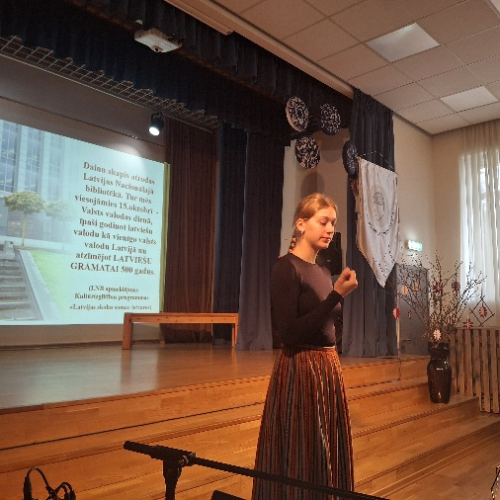 Svētkus atklājām ar valsts himnu “Dievs, svētī Latviju”. Tad izskanēja virkne  skolēnu skandētas tautas dziesmas, jo šogad atzīmējām  folklorista, publicista, dzejnieka, rakstnieka, pedagoga, jaunlatviešu kustības dalībnieka Krišjāņa Barona 190. gadskārtu. Runājām par tautas dziesmu krājuma “Latvju dainas”  nozīmību mūsu nācijas tapšanā. Lepojāmies ar Dainu skapi, kuru aplūkojām Latvijas Nacionālajā bibliotēkā. Savukārt LNB  izstāde “Latviešu grāmatai 500” iedvesmoja mūs piedalīties akcijā “Mans grāmatplaukts”.